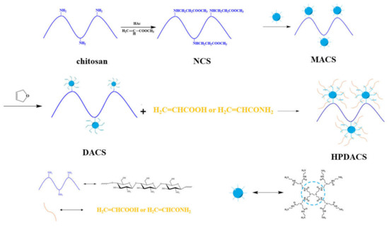 Synthesis schematic route of NCS (modified chitosan), MACS (further modified chitosan), DACS (branched monomer modified chitosan) and HPDACS (chitosan modified hyperbranched polymer).