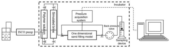 The experimental flow chart is shown in Figure 3. The sandpack model consisted of an HXH-100B double-cylinder, constant-flow, constant-pressure pump; 1000 mL piston containers and pressure sensors with measuring ranges of 0–1 and 0–5 MPa. The pipeline has an inner diameter of 3 mm, and the one-dimensional sandpack model at a size of 25 × 2.5 cm has gas/liquid collectors. Both were purchased from Hai’an Petroleum instrument Co., Chengdu, China.