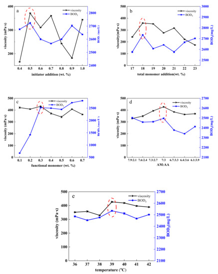 The effects of initiator addition, total monomer concentration, functional monomer addition, AM:AA (mass ratio), and reaction temperature on polymer viscosity and BOD5 were investigated by single-factor experiment, and the results are shown in Figure 4. The following optimal synthesis conditions were established: initiator addition of 0.5 wt.%, total monomer concentration of 18 wt.%, functional monomer addition of 0.3 wt.%, AM:AA of 7:3, and reaction temperature of 39 °C.