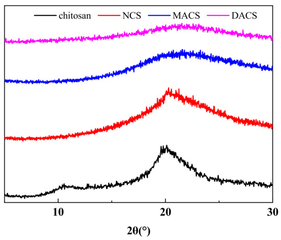 Figure 6 shows the X-ray diffraction pattern of chitosan, NCS, MACS, and DACS. Characteristic diffraction peaks of chitosan were observed at 2θ = 10° and 2θ = 20°. From NCS to DACS, the characteristic diffraction peak of 2θ = 10° disappeared, and the characteristic diffraction peak of 2θ = 20° gradually weakened. This phenomenon is mainly due to the continuous destruction of intermolecular and intramolecular hydrogen bonds on the chitosan surface with the progress of the reaction, resulting in the weakening and disappearance of the diffraction peak. This result further proves the reasonability of the molecular structure design.