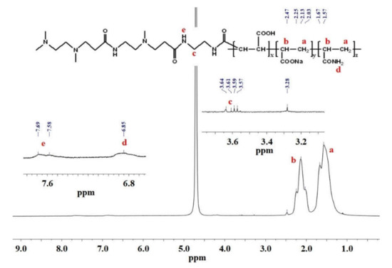 Figure 7 shows the 1HNMR spectrum of HPDACS. The chemical shifts at 1.57 and 2.2 ppm were related to the proton of –CH2 on AA and AM chains, respectively. The signal-observed peak from 3.5 ppm to 3.7 ppm was caused by the proton of –CH2–NH–, indicating the existence of the branched monomer DACS in HPDACS. The peak values at 6.85 and 7.69 ppm were attributed to the proton of –NH– on CS and the proton of –NH–CO– on the branched monomer chain, respectively. Hence, the structure of HPDACS was consistent with the original assumption based on 1HNMR results.