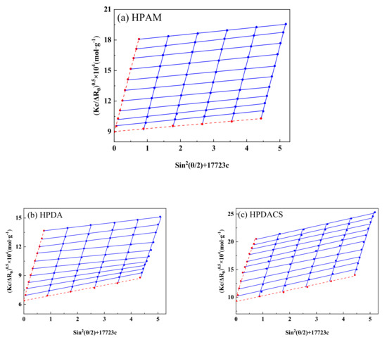 The fitting graph in Berry form is nonlinear. After deformation, the intercept of the vertical axis is Mw−1/2 when sin2 (θ/2) + 17723c is the abscissa and (Kc/ΔRθ)0.5 is the ordinate. The ratio between the intercept and the longitudinal axis data is relatively large, and the error of experimental data has minimal influence on the determination of weight-average molecular weight. Therefore, the Berry algorithm was used for mapping to calculate the corresponding polymer solution weight-average molecular weight (Mw). Finally, the weight-average molecular weights of HPAM, HPDA, and HPDACS were converted to 7.69 × 106, 7.31 × 106, and 8.52 × 106 g/mol, respectively. The results are shown in Figure 8.