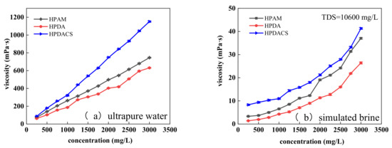 Thickening ability is one of the most important properties of a polymer acting as a displacement agent. The apparent viscosities of HPAM, HPDA, and HPDACS at different concentrations were measured by a DV-III rheometer (Brookfield Co., Middleboro, MA, USA) at 60 °C.