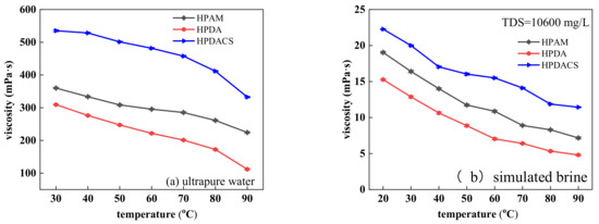 The stabilities of HPAM, HPDA, and HPDACS were evaluated. The effects of temperature, salinity, mechanical shear strength, and aging time on the solution viscosity in ultrapure water and simulated brine were also investigated. Apparent viscosity was measured with a DV-III rheometer, and the influence of mechanical shear strength on the apparent viscosity of the solution was investigated with a WT-VSA2000B Waring mixer (Beijing Exploration Engineering Research Institute of China Geological Survey, Beijing, China) at shear strengths of 3500, 7000, and 11,500 rpm for 20 s.