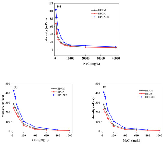 Under the same conditions, HPDACS had a higher viscosity retention rate than HPAM and HPDA because the modified chitosan monomer and branched monomer make the HPDACS network structure highly compact and regular, thereby potentially increasing the crimping difficulty of HPDACS and reducing the crimping degree of its molecular chain to a certain extent. Moreover, the steric hindrance effect of chitosan structure also weakened the influence of metal ions on polymer molecular chains. Hence, HPDACS show better salt resistance than the two. When the added amount of salt in the solution reached a certain amount, the shielding effect of the metal ions was maximized, and the macromolecular chain could no longer be curled. Hence, the viscosity of the polymer solution did not change.