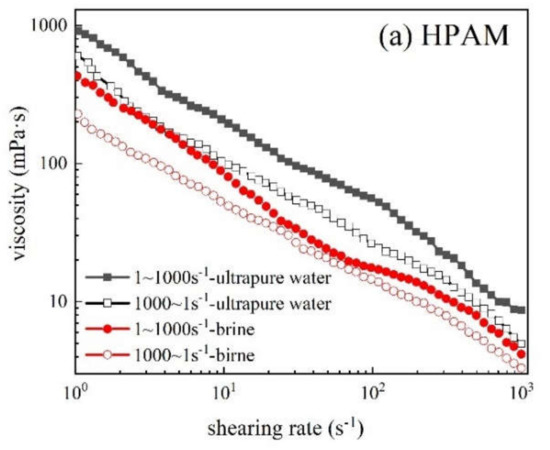In ultrapure water and simulated brine, the rheological curves of three polymers (1500 mg/L) at 60 °C and shear rate of 1–1000 s−1 are shown in Figure 15. Within the shear rate curve of 1–1000 s−1, the apparent viscosity of the three polymer solutions decreased gradually with the increase in shear rate, and all showed the characteristics of pseudoplastic fluid that is conducive to improve the injectability of polymer solution. This phenomenon occurred due to the intermolecular entanglement and interaction in the polymer solution system. When the polymer solution was continuously subjected to shear action, the entangled structure was destroyed and cannot be restored to the original state in time. Therefore, the polymer solution showed decreased viscosity and shear dilution. When the shear rate was 1–1000 s−1, the viscosity of HPDACS was higher than those of HPDA and HPAM in ultrapure water and brine. The viscosity retention rate of HPDACS was also higher than those of HPAM and HPDA from high shear to low shear (1000–1 s−1).