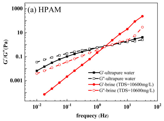The rheological property of a polymer enables the random coils of its molecules to deform and migrate when passing through porous media without strong shear and tensile degradation, thus effectively avoiding serious viscosity loss for the polymer. Furthermore, the blind residual oil in the formation is “pulled and dragged” by the viscoelasticity of the polymer solution; a material with high viscoelasticity can carry a large amount of oil and produce a high recovery ratio [38,39,40]. In laboratory research, elastic modulus (G′) and viscous modulus (G″) are often used to describe the elasticity and viscosity of polymer solution.