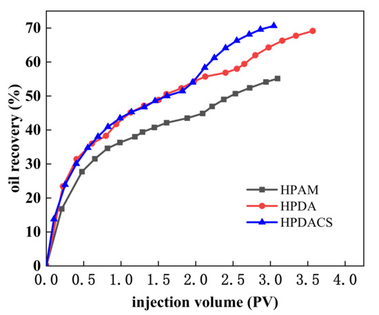The oil recovery of HPAM, HPDA, and HPDACS is shown in Figure 17 and Table 10. When the water content reached 95% and 0.3 PV HPAM was injected, HPAM flooding improved the crude oil recovery ratio by 10.65%, and the cumulative recovery ratio of the whole water flooding and HPAM flooding was 55.14%. Under the same conditions, the enhanced crude oil recovery ratio by HPDA flooding was 13.72%, and the cumulative recovery ratio by water flooding and HPDA flooding was 70.57%. When 0.3 PV HPDACS was injected, HPDACS flooding improved the crude oil recovery by 19.20%, which was higher than those by HPAM and HPDA, and the cumulative recovery was 70.65%.