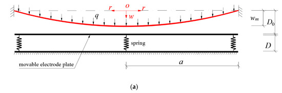 Suppose that an initially flat peripherally fixed circular membrane with Young’s modulus E, Poisson’s ratio v, thickness h and radius a is subjected to a uniformly distributed transverse loads q, as shown in Figure 2a, and as the loads q intensify, it will then come into contact with a smooth frictionless rigid plate (i.e., the movable electrode plate in Figure 1) which is always under the action of the springs with stiffness coefficient k and initial compressed length Δl, as shown in Figure 2b. In Figure 2, the dash-dotted line represents the geometric middle plane of the initially flat circular membrane, in which the polar coordinates plane of the cylindrical coordinates system locates, where r, φ and w represent the radial, circumferential, and transverse coordinates, b represents the contact radius between the deflected circular membrane and the spring-driven frictionless movable rigid electrode plate, D0 is the initial distance between the initially flat circular membrane and the initial position of the frictionless movable rigid electrode plate, D represents the initial distance between the movable and immovable electrode plates in Figure 1, q′ represents the interaction force between the deflected circular membrane and the spring-driven frictionless movable rigid electrode plate, wm represents the maximum deflection of the circular membrane and for the contact state between the deflected membrane and the spring-driven frictionless rigid plate.