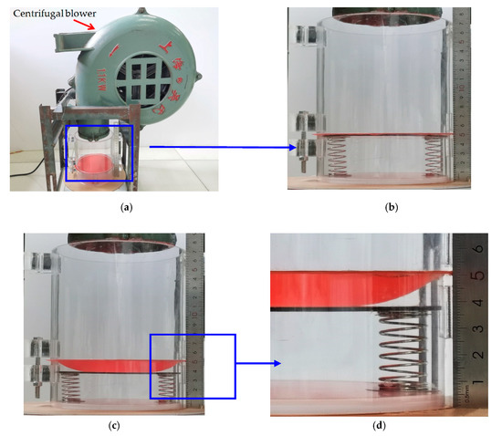 To assess the effectiveness of the closed-form solution presented in Section 3, we conducted a simple experiment. The photos of the experimental setup are shown in Figure 4. A piece of thin synthesized latex film (2-ethyl hexyl methacrylate) with elastic modulus Pa, Poisson’s ratio and thickness mm is clamped by the two round ends of two transparent Acrylic hollow cylinders with inner radius , and the lower surface of the circular polymer thin film is in contact with a movable circular Acrylic plate with radius mm and thickness mm. The lower surface of the movable circular Acrylic plate is connected to two springs with stiffness coefficient , uncompressed original length mm, and initial compressed length mm. A centrifugal blower with AC 220 V and 1.1 KW was used to produce a 1707 × 10−3 kg (16.73 N) force, which is acting on the upper surface of the circular polymer thin film with radius 70 mm, converted to the transverse uniformly distributed loads Pa, the wind pressure value per unit area on the circular plane with radius 70 mm.