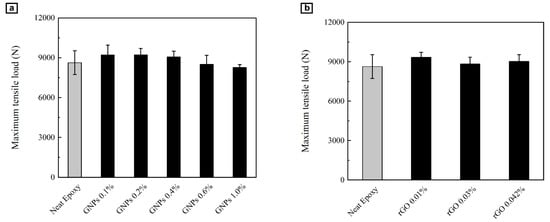 Tensile test was used to evaluate the mechanical properties of graphene-reinforced glass fiber/epoxy composites. As seen in Figure 2, maximum tensile load of glass fiber/neat epoxy with incorporation of graphene nanoparticles increases from 8.63 ± 0.9 kN to higher levels of 9.22 ± 0.48 kN in the case of 0.1 wt.% of graphene nanoplatelets concentration, representing an improvement of 6.8%. In a similar way, specimens with 0.01 wt.% of rGO exhibited an 8.2% enhancement in final load capacity. These results confirm enhanced ultimate tensile load capacities of nanocomposites.
