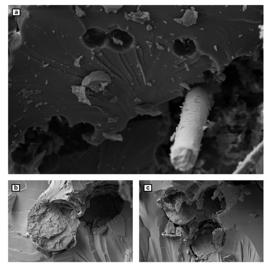 In contrary, Figure 3b shows a better adhesion strength between different phases in cases of nanocomposites. There are no gaps or holes showing adhesion failure between the fibers and the matrix. The graphene-modified glass fibers and the epoxy resin consisting of nanoparticle additives acted as a single component during breakage which suggests accordingly strong bonding. Non-symmetric shapes of the holes and the rough surface of the fibers indicates a cohesive structure of nanocomposites, offering a proper load transfer between the epoxy matrix and reinforcement phase which can adsorb more energy before failure of the sample. This improvement can be explained by the anchoring effect of nanoparticles existing in the interface of the two phases.