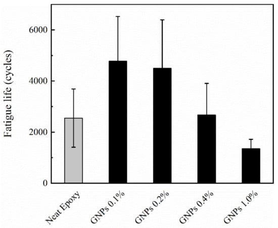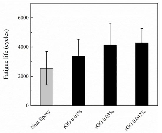 The influence of rGO loading on fatigue life of multiscale GFRP nanocomposites is shown in Figure 4. As depicted in this graph, all of the rGO loadings resulted in significant enhancement in fatigue properties of the nanocomposites. For instance, an increase of 68% was observed for the loading of 0.042 wt.% of rGO. These enhancements can be related to the formation of more links between the nanoparticles and the GFRP. Accordingly, better bonding led to stronger resistance to failure and enhancement of the final properties of the composites. This trend was also observed in References [16,28].