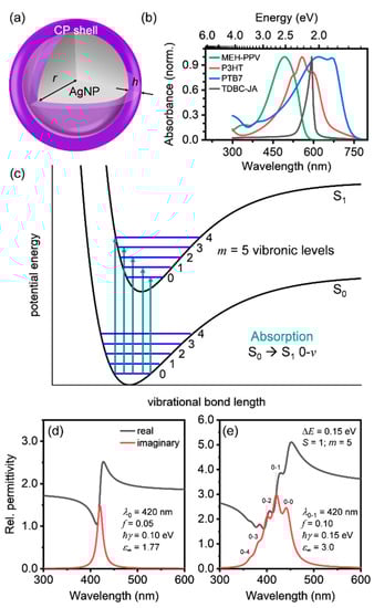 Although conjugated polymers have broader spectral linewidths (50 meV to greater than 1 eV) [32,33,34,35] than typical excitonic materials employed in strong coupling studies, their large chromophore density manifests in very large [1,36,37], which, when coupled to the strong electromagnetic fields from LSPRs, can potentially result in ħΩ exceeding both γsp and γex. Much of the broadening observed in conjugated polymers arises from their strong electron-phonon coupling, whereby the electronic response of conjugated polymers is heavily influenced by vibrational modes [38,39]. There have been a few recent theoretical studies demonstrating that vibrationally-dressed excitonic states can strongly couple with microcavities [40,41,42]. We have previously demonstrated coupling between excitons in conjugated polymers and surface plasmons arising from metasurfaces [43,44], nanoparticle-on-mirror [45], and semiconductor-metal-insulator waveguide [46] geometries. Additionally, it has been demonstrated that when plasmonic nanostructures are embedded into broadband, conjugated polymer-fullerene photovoltaic absorber layers that the largest absorption enhancements occur at wavelengths slightly red-shifted from the absorption edge of the absorber (i.e., at the “red-edge”) [43,47,48,49,50,51,52]. This red-edge absorption enhancement occurs frequently for a wide range of different plasmonic-enhanced conjugated polymer photovoltaics, which suggests the pervasive presence of plasmon–exciton coupling, where the long wavelength plasmon–exciton hybrid mode leads to the strongest absorption enhancement. Here, we demonstrate, using electromagnetic simulations, that, despite the large absorption bandwidth and strong vibronic nature of conjugated polymers, plasmon–exciton coupling using realistically modeled conjugated polymers can result in ultra-strong coupling, with Rabi splitting energies reaching values greater than 1000 meV. We investigate plasmon–exciton coupling using a conventional core-shell hybrid nanostructure (Figure 1a), with spherical Ag nanoparticles (AgNPs) as the core of the hybrid structures and model conjugated polymers as the shell.