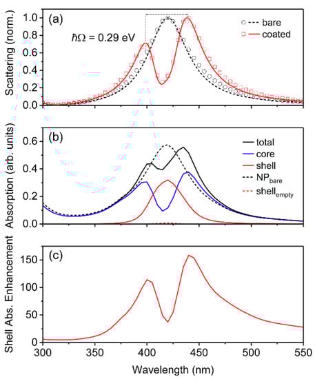 (a) Normalized scattering, (b) absorption, and (c) shell absorption enhancement from core-shell nanoparticles with shell relative permittivity described by a single Lorentzian oscillator. The AgNP radius and shell thickness were r = 25 nm and h = 5 nm, respectively, and the shell parameters used were: λ0 = 420 nm; f = 0.05; ħγ = 0.10 eV; ε∞ = 1.77. Note that ħΩ represents the splitting energy between the plasmon–exciton hybrid modes, obtained from the scattering spectra, as shown in (a). In (a), solid lines represent normalized scattering cross-section calculated using analytical Mie theory, and open symbols represent normalized scattering cross-section calculated using numerical finite-difference time-domain (FDTD) simulations. In (b,c), only results from the FDTD simulations are shown, using Equation (2) to calculate the absorption in each layer.