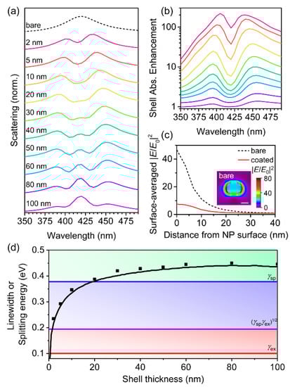 We initially studied very thin absorber shells, which have been the primary focus of core-shell plasmon–exciton coupling studies to date. This is because for core-shell nanostructures, typically only a monolayer of the J-aggregates adsorbs to the surface of the metallic nanoparticle. In addition, the photoluminescence of thin-films of J-aggregates is known to be drastically quenched relative to J-aggregates in the monolayer [67]. However, in many instances of metal nanoparticle-conjugated polymer heterostructures, the conjugated polymer layer is significantly thicker [49,50,51,52], partially because conjugated polymers undergo minimal photoluminescence quenching in the solid state. Therefore, we investigated the dependence of the shell thickness on the scattering and absorption from the core-shell NPs, initially using the single Lorentzian oscillator model for the relative permittivity of the shell material with f = 0.05 and ħγ = 0.10 eV (Figure 3). As h increased, the splitting energy between the hybridized modes increased (Figure 3a,d). As h increased to 20 nm and beyond, the coupling regime transitioned from induced transparency to strong coupling (Figure 3d), and a third peak started to develop at the resonance wavelength (Figure 3a). The formation of a three-peaked spectrum has been reported previously in studies of plasmon–exciton coupling, and the central peak was attributed to a shell mode that screens the metal core from the incident electromagnetic fields (Figure 3c, inset) [28]. As h was increased further, the shell mode became more dominant, suggesting that the Ag core became screened to a larger extent as the shell thickness increased. The splitting values began to saturate for h ≥ 30 nm (Figure 3d), because the localized electric field enhancement from the LSPR of the AgNP decayed to a value of unity at a distance of 40 nm from the NP surface (Figure 3c). Therefore, for shell thicknesses greater than 30 nm, only the portion of the shell within the first 30 nm was strongly coupled to the LSPR from the Ag core, and the remaining portion of the shell was weakly coupled or uncoupled and acted simply as an optical filter.