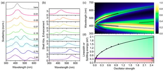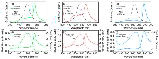 We next chose ħγ = 0.30 eV as representative of typical conjugated polymers [32,34,69], and varied f for h = 40 nm (Figure 4). Conjugated polymers typically have f ranging from ~0.02 to up to 5 for each oscillator [33,34,35]. As f increased, the splitting in the scattering and shell absorption enhancement spectra increased (Figure 4a,b). For f > 0.05, three peaks were observed in the scattering spectra, with the third, central, shell mode increasing in intensity with increasing f and becoming the dominant mode for f > 0.3. The normalized scattering of the short wavelength plasmon–exciton hybrid mode decreased in intensity with increasing f, completely disappearing by f > 0.5 (Figure 4a,c). However, the long wavelength mode continued to red-shift and remained relatively intense, even for large f values. The dominance of the long wavelength plasmon–exciton mode was further observed in the shell absorption enhancement spectra, in which the ratio of the long- to short wavelength mode continued to increase with increasing f, until the short wavelength mode no longer had any influence on the shell absorption enhancement for f ~ 1. The reason why the long wavelength plasmon–exciton hybrid mode had greater scattering intensity and, thus, shell absorption enhancement, was because scattering efficiency increases with increasing relative permittivity (see Supplementary Materials Figure S3), and for λ > λ0, the relative permittivity of both the shell and the AgNP core increase. This gave rise to increased scattering intensity for λ > λ0, and decreased scattering intensity for λ < λ0. Because the scattering intensity determines the shell absorption enhancement, the long wavelength plasmon–exciton hybrid mode was more important for achieving significant absorption enhancement within the conjugated polymer shell.