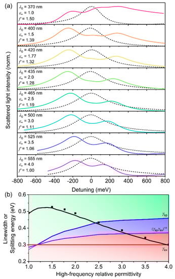 Variation of high-frequency relative permittivity, ε∞, for core-shell structures with a single Lorentzian oscillator shell with h = 40 nm, f = 0.10, and ħγ = 0.30 eV. (a) Normalized scattering spectra calculated using FDTD simulations. Note that λ0 was selected as the LSPR wavelength of bare AgNPs in a background relative permittivity equal to ε∞ (black dashed line). The f’ values listed are the scaling factors by which f was divided in order to have normalized amplitudes of the imaginary components of the relative permittivity to account for the shifted λ0. (b) Splitting energy for hybrid plasmon–exciton modes calculated using FDTD simulations (symbols) and Mie theory (black line). The background shading represents the coupling regimes (green—strong coupling; blue—intermediate coupling; red—weak coupling) as defined by the linewidths of the surface plasmon (γsp—blue line), the exciton (γex—red line), and the relationship: (purple line), given in Equations (7)–(9).