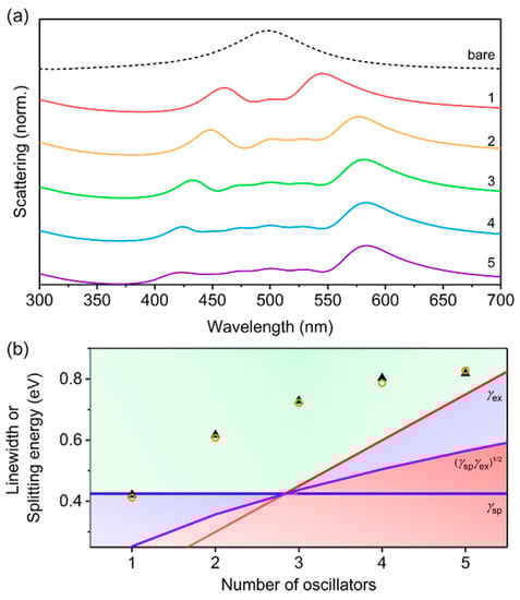 Variation of number of oscillators, m, for core-shell structures with shell relative permittivity described by the Franck-Condon progression (Equations (5) and (6)) and with h = 40 nm, f = 0.10; ħγ = 0.15 eV; ΔE = 0.15 eV; ε∞ = 3.0; and S = 1. The most intense oscillator (i.e., the 0-1 transition for m ≥ 2) was resonant with the uncoupled LSPR of the AgNP (i.e., 500 nm), with additional vibrational modes either blue- or red-shifted from the uncoupled LSPR. (a) Normalized scattering spectra calculated using FDTD simulations. (b) Splitting energy for hybrid plasmon–exciton modes calculated using FDTD simulations (black solid triangles) and Mie theory (orange open circles). The background shading represents the coupling regimes (green—strong coupling; blue—intermediate coupling; red—weak coupling) as defined by the linewidths of the surface plasmon (γsp—blue line), the exciton (γex—red line), and the relationship: (purple line), given in Equations (7)–(9). The splitting energy was obtained from the scattering spectra as the difference in energy between the highest and lowest energy hybrid modes.