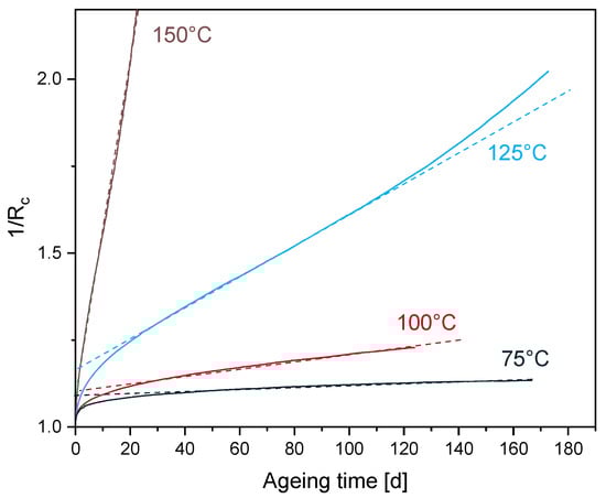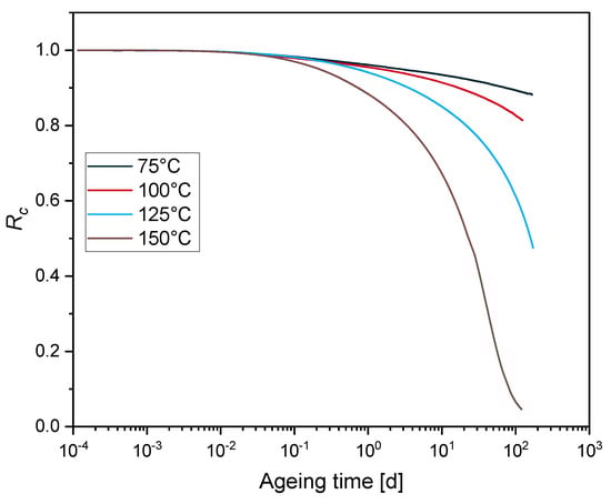 exhibits two regions: a flat decrease at the beginning and a stronger decrease at longer ageing times. The first phase correlates with physical relaxation, while the second phase correlates with chemical relaxation []. The second phase is more pronounced for EPDM aged at 125 °C and 150 °C. For EPDM aged at 75 °C and 100 °C, the samples are not sufficiently aged to obtain the second phase as the minimum  values are 0.88 and 0.8, respectively, although the experiment was run for over 168 days and 124 days.