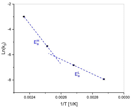 Correlation of the second-order kinetic rate constants  to the Arrhenius relationship. (linear regression fit for 150 °C + 125 °C and 100 °C + 75 °C, respectively: blue dashed lines).