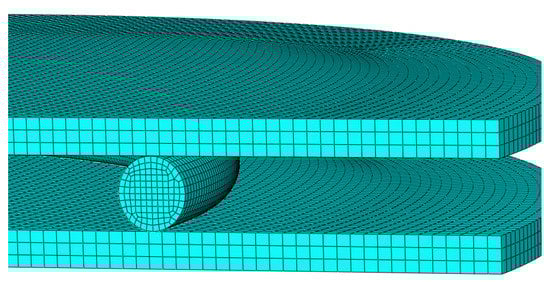 Meshed O-ring segment in assembly between two steel plates (Young´s modulus: E = 210 GPa, Poisson’s ratio: ν = 0.3).