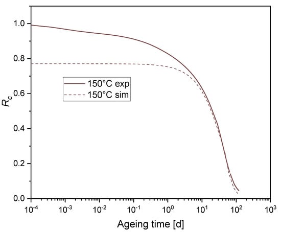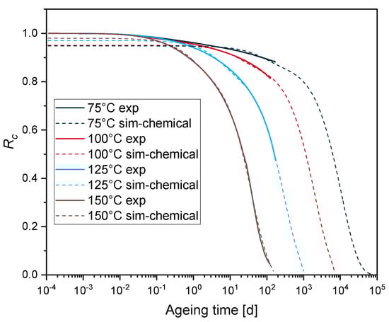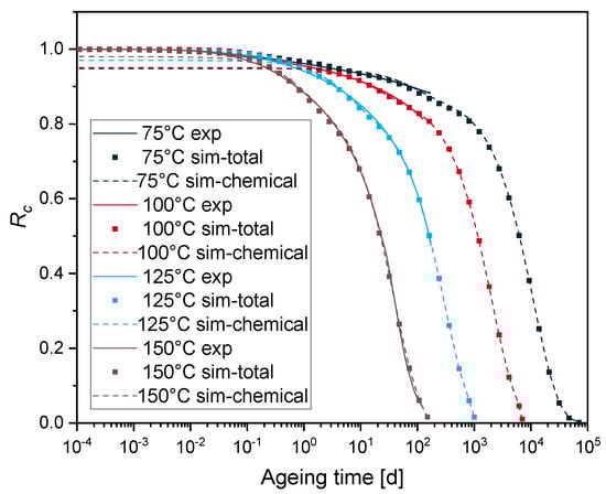 It is worth mentioning that material compounds have an influence on several non-Arrhenius complications and that the curvature can arise from faster stabilizer consumption/migration or antioxidant interactions as solubility and evaporation effects are closely linked to temperature []. The investigation of non-Arrhenius behavior [,,] was performed on EPDM with different compound recipe and geometry from the material of the present study. In [,], disk-shaped samples with 12.7 mm diameter and a 2 mm width were stacked to give a height of 6 mm that are named in the following as EPDM-sheets. As a guidance in the following, we present a comparison between our material (EPDM-rings) and the one used in [,,] at the same ageing temperature of 125 °C. Taking the same ageing temperature of 125 °C and a criterion of Rc = 0.1, the EPDM-sheet reaches this criterion after 162 d, while our material after ageing for 162 d has an Rc of 0.5. This value is determined from the experimental data. From the simulation, the EPDM aged at 125 °C achieves Rc = 0.1 after 640 d. Note that the compression stress relaxation measurements of EPDM-sheet were conducted at room temperature, and the values of the initial force for compression were determined by extrapolation to t = 0 of samples aged between 1 d and 14 d []. Moreover, DLO of EPDM-sheet samples aged at 125 °C was detected for an ageing time of 210 d, which is not the case for our material. In our previous investigation [], no DLO effects were detected for EPDM O-rings aged at 125° C for 549 d, although our material is thicker, which normally enhances the appearance of DLO effects.