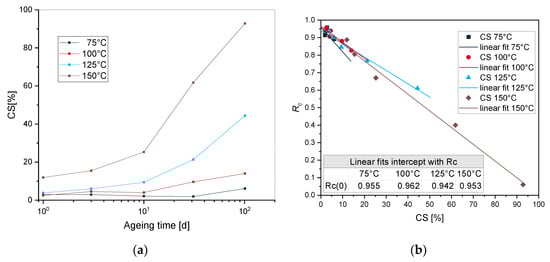 CS data after tempering are used in the identification to separate physical and chemical relaxation stages. Figure 6a shows the evolution of equilibrium CS versus ageing time for EPDM aged at 75 °C, 100 °C, 125 °C and 150 °C. According to our previous investigations [], characteristic times related to the degradation processes were determined for EPDM aged at 125 °C. The chemical initiation time which represents the end of physical relaxation stage and the onset of chemical relaxation one [] was determined through the intercept of Rc versus CS values after tempering at CS = 0. With the Rc intercept values presented in Figure 6b, one can determine the chemical initiation times at 150 °C, 100 °C and 75 °C, that are suitable for the modeling section from the stress relaxation data versus ageing times (Figure 1).