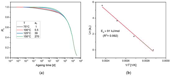 For this purpose, we first shifted the 100 °C curve longer ageing times, until a superposition was obtained at the last part with the 75 °C data. For 125 °C and 150 °C data, the superposition was better, as seen in Figure 9a. To determine the functional relationship between the shift factors and the temperature, the Arrhenius treatment is combined with TTS (Figure 9b), through drawing the shift factors (aT) in an Arrhenius diagram.