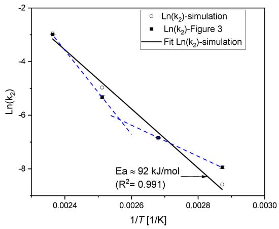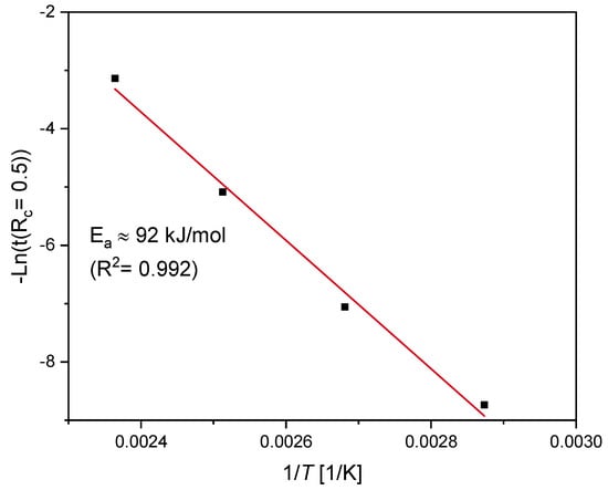 The same procedure presented in the kinetic study section was reproduced with the modeled estimations of the long-term stress relaxation, in order to test the validity of the Arrhenius approach. From Figure 6b, the chemical initiation time for Rc is around 0.94, which represents the onset of irreversible chemical degradation. Hence, it would be suitable to perform the analysis on sufficiently aged samples at the same degree of degradation for all ageing temperatures. All fits are performed for the simulation results of Rc sections between 0.8 and 0.26, and the resulting slopes () are determined. The correlation of the  to the Arrhenius relationship is shown in Figure 11. A better fit to the Arrhenius approach for the simulated results with an Ea ≃ 92 kJ/mol is obtained. The obtained Ea value with the kinetic study that was performed on the simulation results over an extended time frame is the same as that for 50% loss of sealing force, which was determined via the Arrhenius approach shown in Figure 10. The Ea value with the kinetic study, in comparison with the TTS applied to the experimental data given in Figure 9, is very close.