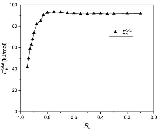 Since the Arrhenius approach is based on the assumption that the degradation involves only a single thermally activated chemical process, the resulting apparent total activation energy yields could be assumed as weight-averaged values of different activated chemical processes. The evolution of the total activation energy of the system  (see Figure 12) could be connected to the single-process energies  and  through a rule of mixture, as presented below: