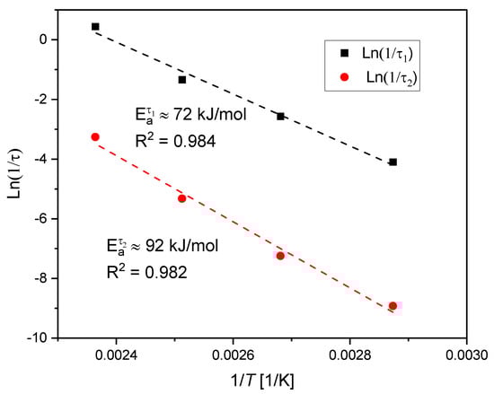 From the modeling section, two first order chemical relaxation processes with two relaxation times  and , respectively, were determined, each related by the Arrhenius relationship, as depicted in Figure 13. The activation energies  and  for the first and the second process respectively are also presented in Figure 13.
