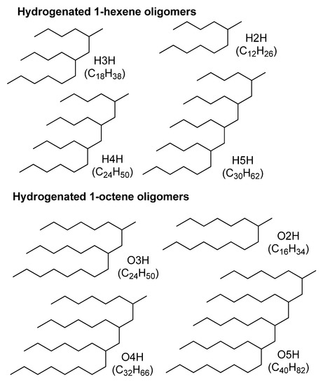 At room temperature, these oligomers are liquids, their molecules contain from two to five alkyl chains, as illustrated in Figure 1. Each chain monomer subunit in the 1-hexene and 1-octene oligomers consists of six and eight carbon atoms, respectively. The total number of the carbon atoms in a molecule varies from 12 to 40. Depending on the number and length of the alkyl chains in a molecule, the pour points and kinematic viscosity at 100 °C (KV100) of these liquids vary from –66 to −94 °C; and from 2.2 to 6.5 cSt, respectively. The moderate viscosity at low temperatures and low pour points make these compounds attractive as bases of high-quality freeze-resistant poly-α-olefin oils (PAOs) and lubricants [1,3]. Additionally, such hydrogenated oligomers, like linear alkanes, can be regarded as model structures for studying a molecular arrangement of biomembranes and lipids [4,5,6].