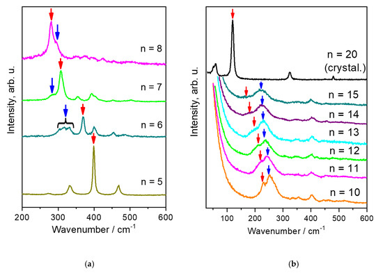 Raman spectra of linear short-chain (a) and long-chain (b) linear alkanes in the region of longitudinal acoustic mode (LAM; red arrows) and disorder LAM (D-LAM; blue arrows) bands.