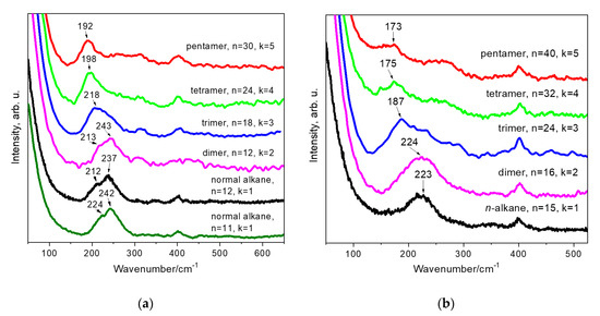If we consider the vibrations of chains in the oligomer molecules as independent and apply directly our knowledge about Raman spectra of linear alkanes, we should expect an appearance of Raman bands about 317–370 cm−1 for the 1-hexene oligomers and about 280–296 cm−1 for the 1-octene oligomers (i.e., with wavenumbers), related to the D-LAM and LAM in alkyl chains with 5-8 carbon atoms (Table 1 and Table A1). Thus, if this approach is correct, the Raman spectra of the oligomers in the low-wavenumber region should be similar to that of liquid short-chain alkanes (n = 5–8). In addition, no shift of the LAM and D-LAM bands with increasing the number of carbon atoms is expected.