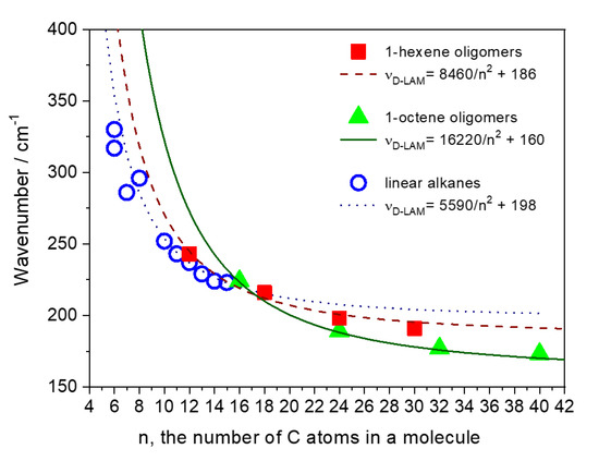 However, in the low-wavenumber area the Raman spectra of the hydrogenated α-olefin oligomers, like that of the liquid long-chain alkanes (n = 10–15), demonstrate a broad band (Figure 2b and Figure 3). This band, which we assign to the D-LAM, shifts to lower wavenumbers when the total number of carbon atoms increases in an oligomer molecule. Figure 4 shows the dependences of the peak position of the D-LAM band on the total number of C atoms for liquid linear alkanes and the oligomers under study. We found out that νD-LAM in the Raman spectra of the hydrogenated oligomers, like that of the D-LAM band for linear alkanes, depends on n as:
