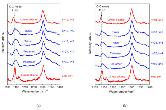 The Raman spectra of the oligomers and linear alkanes in the region 1110–1400 cm−1 differ dramatically, in the first turn, in the spectral features of the C–C bands (Figure 5).
