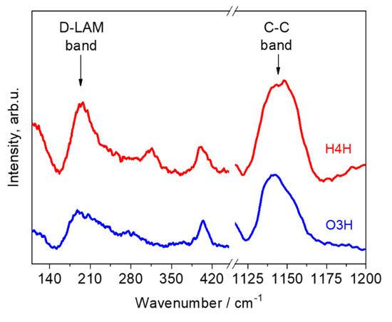 Therefore, the peak position of the C–C mode can be used as a measure of length of the branched chains, but not as a characteristic of the total number of C atoms in the oligomer molecules. Thus, the jont monitoring of the D-LAM and the C–C mode allows for distinguishing the hydrocarbon isomers—linear alkanes and the 1-hexene and 1-octene oligomers. For instance, Figure 7 shows the D-LAM and C–C bands of the isomers under study with chemical formula C24H50: 1-hexene tetramer (H4H) and 1-octene trimer (O3H). As can be seen from this figure, the spectra of these oligomers demonstrate differences in the peak positions and shapes of the D-LAM and C–C bands.