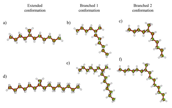 Density functional theory (DFT) calculated conformations of dimers of 1-hexene (a–c) and 1-octene (d–f): extended-chain conformation (a,d), branched 1 chain conformation (b,e), branched 2 chain conformation (c,f).