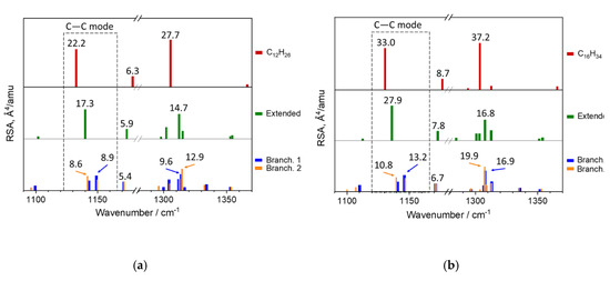 DFT calculations confirmed potential of analysis of the symmetric C–C stretching mode to distinguish the extended and branched chain conformations. According to the DFT calculations, Raman spectra of the dimers (or alkanes) in the extended-chain conformation contains only one Raman-active line, which corresponds to the symmetric C–C stretching mode (Figure 9). By contrast, two lines, related to the symmetric C–C stretching mode, appear in the case of the branched conformations. DFT wavenumbers for the branched conformations are shifted towards higher wavenumbers as compared with the DFT wavenumbers for the extended-chain conformation. Sums of the RSA values of these modes are close to the RSA for the extended-chain conformation (Figure 9, Table 2 and Table 3).