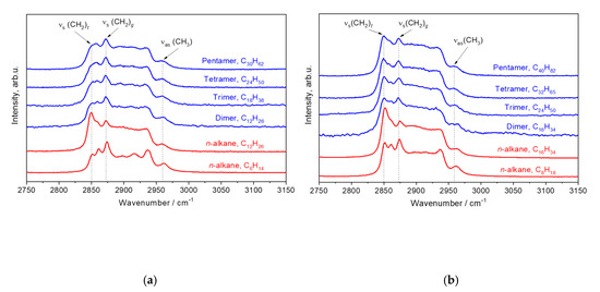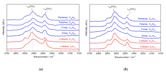 The polarized spectra, which are recorded at the crossed orientation of the exciting and scattered radiations in the region 2750–3150 cm−1, are more attractive for structural analysis of the α-olefin oligomers. Figure 11 shows such Raman spectra of the hydrogenated 1-hexene and 1-octene oligomers. In addition, we display in Figure 11 the polarized Raman spectra of the linear alkanes C6H14, C8H18, C12H26, and C16H34 for comparison. According to our previous Raman studies on linear alkanes (with n = 5–17) [24], the most prominent bands in the polarized Raman spectra, which are recorded at the crossed orientation of the exciting and scattered radiations, belong to the asymmetric stretching vibrations of CH2 and CH3 units. By comparing the polarized Raman spectra of the oligomers and alkanes, we assigned the bands νas(CH2) at ~2890 cm−1 and νas(CH3) at ~2960 cm−1 in the spectra of the oligomers to the asymmetric stretching vibrations of CH2 and CH3 units, respectively (Figure 11).