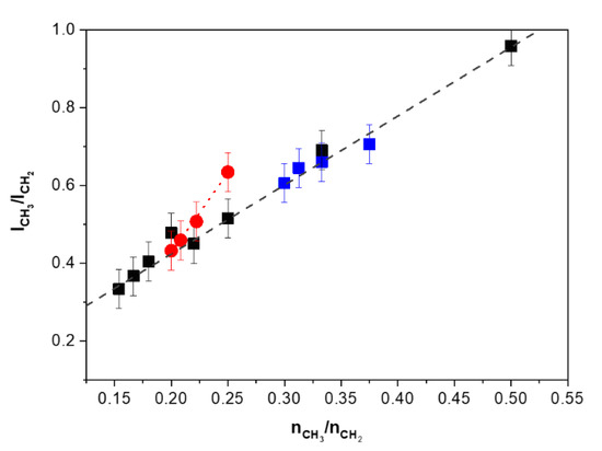 of CH3 and CH2 units for the hydrogenated 1-hexene oligomers (■), 1-octene oligomers (●), and linear alkanes (■). Symbols ■, ●, ■ are the experimental data; dark grey and red dash lines are the linear functions (4) and (5), respectively. The measurement errors of the intensity ratio are also indicated.