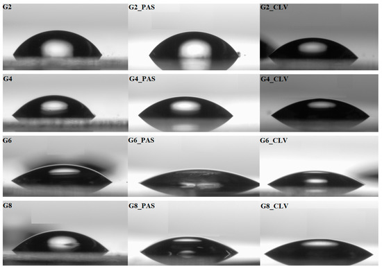 The use of goniometer was also advantageous for the WCA measurements by sessile water drop method to quantity the wettability of the surface of polymer films made by spin coating. The WCA values presented in Table 4 demonstrate dependence on the grafting density, which supported higher values for low DG (G1–G4) than that for higher grafting density systems (G5–G8). The hydrophobicity of polymers was reduced by the increased chain length and the amount of TMAMA units (Cl: 68°–44°). After exchange with pharmaceutical ions the WCA values were reduced for films of ionic drug polymer conjugates showing the improved hydrophilicity of these systems. The changeable wettability is clearly seen in the attached photos of a water drop on the sample surfaces (Figure 4). Furthermore, a similar relationship between hydrophilicity degree and TMAMA content was also observed for conjugate systems (PAS: 66°–30°; CLV: 64°–29°).