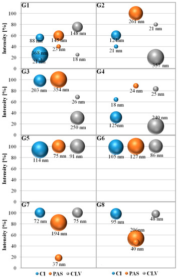 After PAS introduction, the polymer nanoparticles in the prevailing fraction indicated a tendency to increase in size in the range of 24–354 nm, with the exception of G1 and G5 (almost doubly reduced to 145 nm and 75 nm, respectively). Additionally, they were usually characterized by the presence of one fraction, excluding G1, G7 and G8 systems, which existed in two fractions (~20–40 nm and ~140–200 nm as the dominating one). Another relationship was noticed after exchange to CLV−, where the particles mostly became smaller (21–148 nm corresponding to the main fraction as 69%–100%). In this series the systems based on higher density graft copolymers G5–G8 were self-assembled to a homogeneous fraction of particles below 100 nm. Comparing all systems, including those containing drugs, the smallest particles were obtained in the case of sample G4, i.e., 18 nm (Cl−), 24 nm (PAS−), and 25 nm (CLV−) as the dominating fraction (64%–90%). The small particles corresponded to small micelle cores, which were provided by G4 due to the highest content of ionic fraction (43%) and the lowest content of hydrophobic fraction (61%) in the group of copolymers with lower density of ionic side chains grafted from shorter hydrophobic main chain in contrast to the series G5–G8. The detailed data with regard to particular nanoparticle fractions, their sizes, and polydispersity index are given in Table S2.