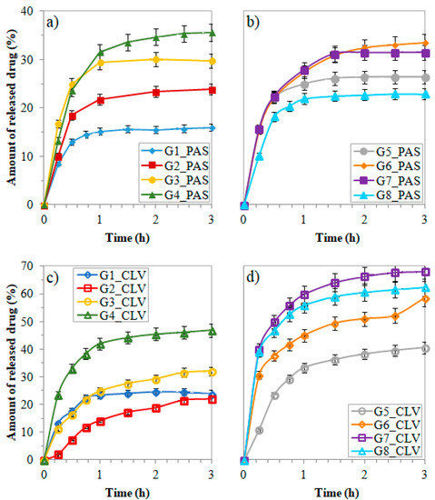The amount of introduced drug in a polymer matrix was verified by drug content (DC, Table 3), which was determined with the use of UV−Vis spectra for systems containing PAS− or CLV−. Dependently on the chemical nature of the pharmaceutical substance, the DC in the polymer matrix with the same hydrophilic-hydrophobic balance differed, indicating 31%–64% for PAS and twice as high for CLV (66%–100%), which could also be related to lower steric hindrance of the latter.