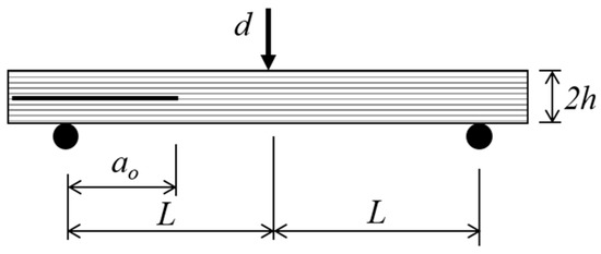 Mode II delamination test was performed using end-notched flexure (ENF) test (Figure 1) according to ASTM D7905 [16]. The specimen’s thickness 2h = 3 mm, initial crack length ao = 30 mm and half span length L = 50 mm. Specimens were taken out from the chamber to perform delamination tests at aging intervals of 4, 12, 27, and 156 days, which corresponded to the moisture content M = 0.23%, 0.42%, 0.61%, and 0.94%. Delamination tests were also carried out for specimens at dry condition. All tests were performed using a Shimadzu Universal Testing Machine (Shimadzu Corp., Kyoto, Japan) with the load cell capacity of 10 kN at 1 mm/min. At least three specimens were tested for each aging interval. All tests were performed at the ambient conditions.