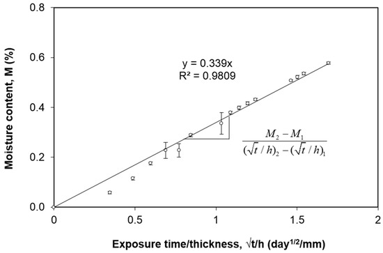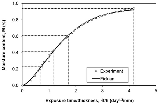 The average experimental moisture absorption curve is shown in Figure 2. The error bars indicate the standard deviation of each measurement. The average maximum moisture content Mm is 0.94%. To apply Fickian diffusion model [18], the slope of the initial linear region which is up to 60% of Mm is fitted (Figure 3). The value of the slope (0.339) corresponds to as described in Equation (4). The diffusivity Dz = 2.56 × 10−2 mm2/day is thus obtained using Equation (4).