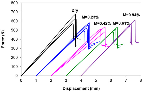 Figure 5 shows the force-displacement curves at various moisture content levels. Upon loading, the force increases linearly with the displacement. When the maximum force is attained, abrupt force drop is noticed for all force-displacement curves. This signifies unstable crack propagation. Figure 6 shows that the average slopes (initial linear region of the force-displacement curves) are 179.99, 160.20, 146.32, 155.65, and 169.31 N/mm at M = 0%, 0.23%, 0.42%, 0.61%, and 0.94%, respectively (marked as dotted lines in Figure 2). The values in bracket indicate the coefficient of variation (C.V) in percentage. The largest C.V is 7.89% for M = 0.42%, which partially implies a good repetition of the specimens and the tests. The underlined values refer to the ratio of the corresponding stiffness with respect to the stiffness at dry condition. In overall, the average stiffness of all wet specimens is lower than the dry specimens, despite the trend is not consistent. The average stiffness decreases with the moisture content until M = 0.42% (with a 19% decrement), and a slight increment is observed after that. Further explanation will be discussed in Section 3.3.