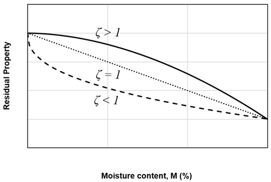Three possible degradation trends of the residual property with respect to the moisture content.