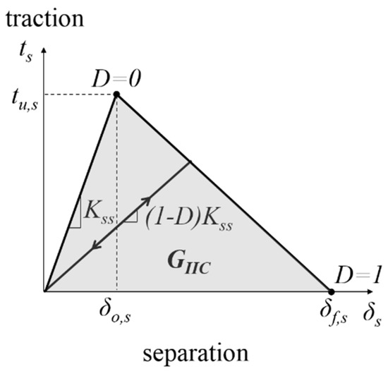 In this study, bilinear traction-separation law is adopted (Figure 9). This law is commonly used due its simplicity and accuracy [15,25,26]. Upon loading, the traction increases linearly with the separation. When the interface shear strength tu,s is reached, damage is initiated (D = 0). Further increment in the separation results in the traction decrement, which signifies softening effect. When the traction is reduced to 0, the element is completely failed (D = 1). The area under the traction–separation curve corresponds to the mode II fracture toughness GIIC.